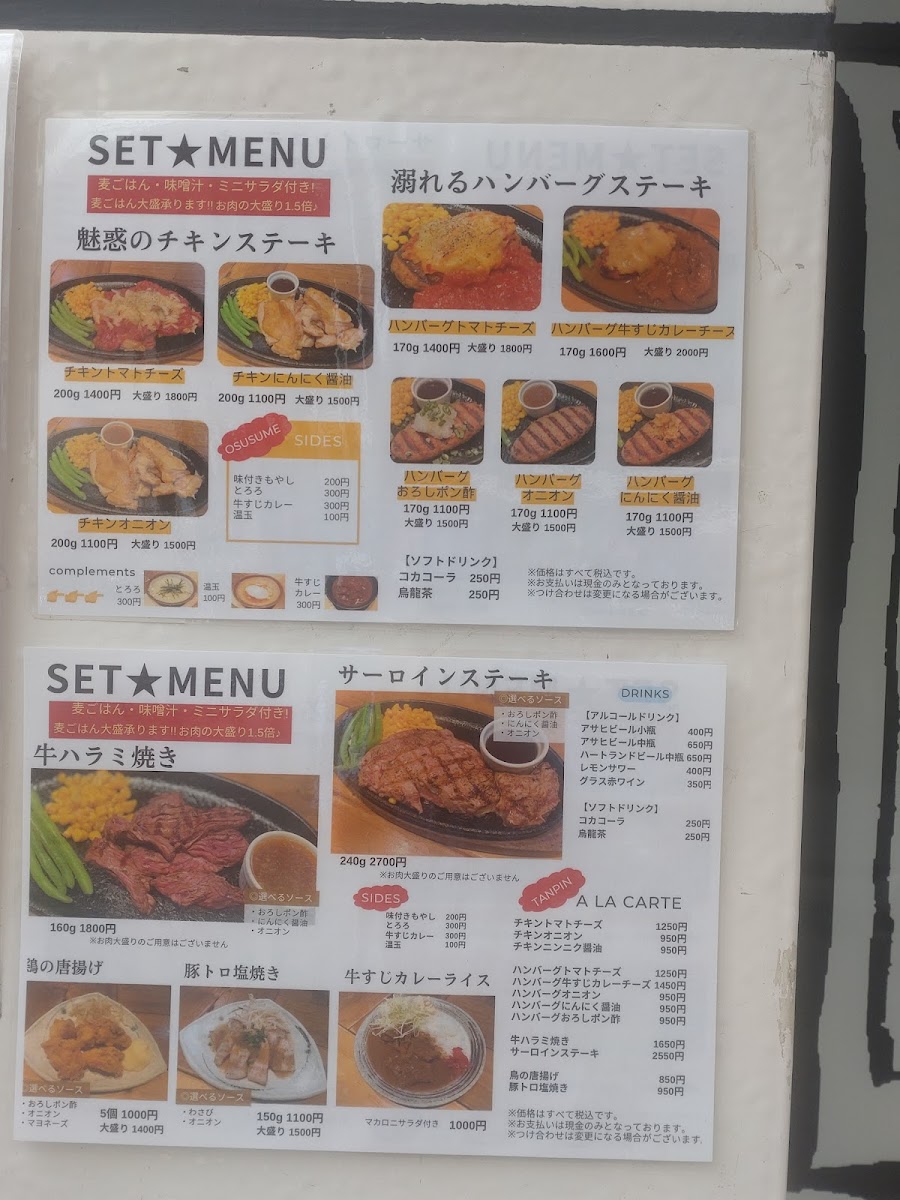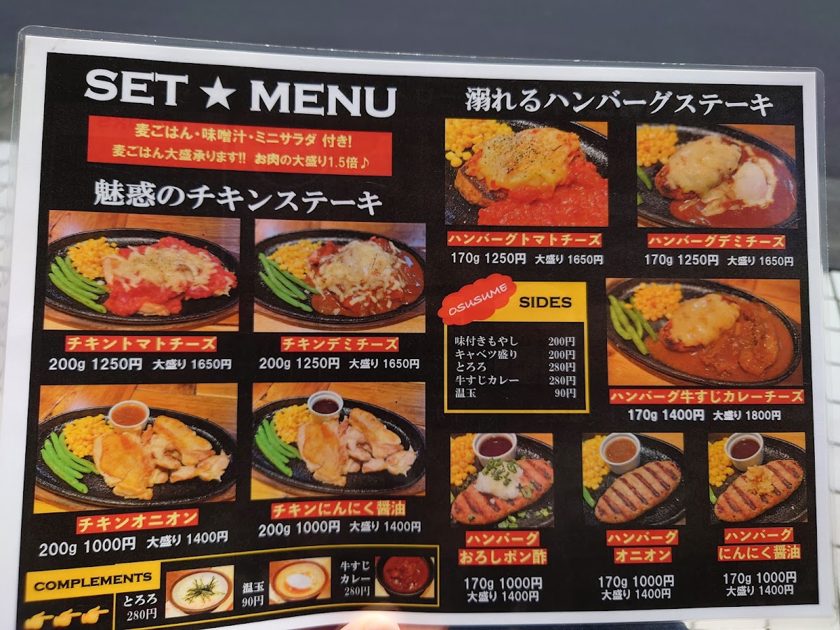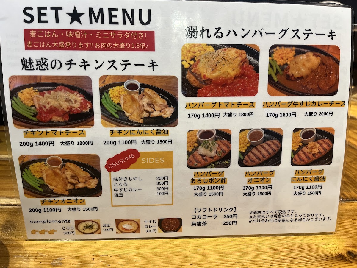 The menu at Shizuru Kyodo Shop offers a delightful variety of flavorful dishes, each carefully crafted to provide a memorable dining experience. One standout option is the ハラミカットステーキ, a tender and juicy cut of beef that will satisfy any steak lover. For those craving a complete meal, the 牛ハラミ焼き定食 焼き肉ダレ&温玉 is an excellent choice, featuring grilled beef with savory barbecue sauce and a soft-boiled egg that adds richness to the dish. A perfect side to complement the main course is the 前菜の盛り盛りキャベツ, a refreshing cabbage salad that cleanses the palate before the main event. For something hearty, the 麦ごはん provides a wholesome accompaniment with its nutty flavor and satisfying texture. The 唐揚げ delivers crispy and flavorful fried chicken, while the チキンステーキ オニオンソース features a juicy chicken steak topped with a rich onion sauce, perfect for those who enjoy a savory touch. If you're in the mood for a comforting dish, the 牛すじカレー チーズ ハンバーグ テイクアウト is an irresistible combination of tender beef stew, curry, cheese, and a flavorful hamburger patty, available for takeout. A bonus is the ご飯おかわり自由, which lets you enjoy as much rice as you desire, ensuring you never run out of this satisfying side. For a refreshing end to the meal, the 温玉シーザーサラダ offers a creamy Caesar salad topped with a soft-boiled egg, adding richness and depth. With its variety and thoughtful combinations, Shizuru Kyodo Shop provides an exceptional menu that caters to a wide range of tastes.